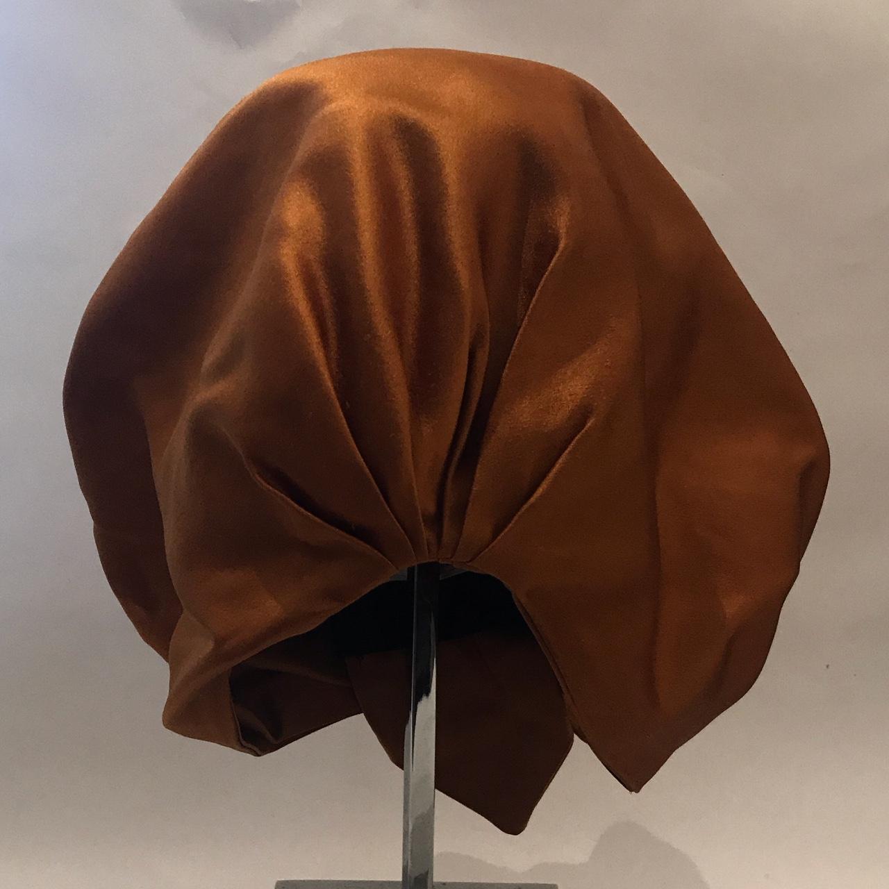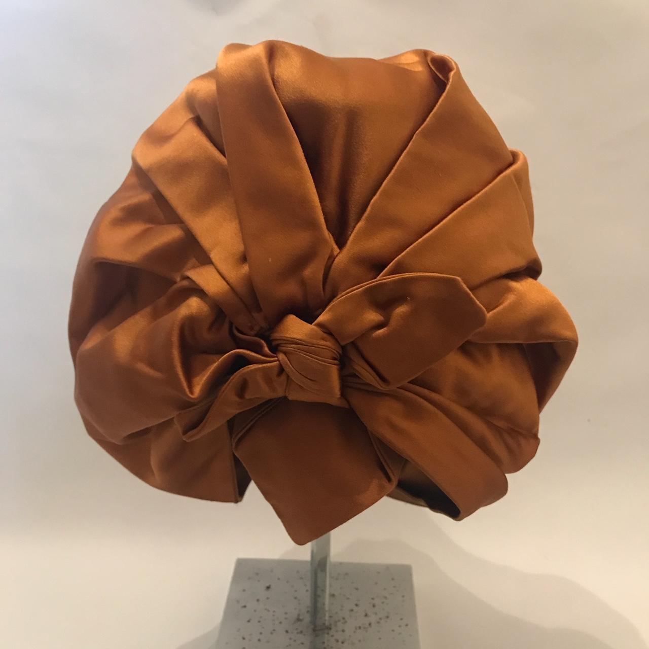 Authentic PRADA Bronze duchess silk satin turban. 100% silk. Pleat and bow detail. Reversible. This was a runway piece from the Spring 2007 collection. Small mark on top, as shown. One size. #prada #luxury #turban #runway #racewear